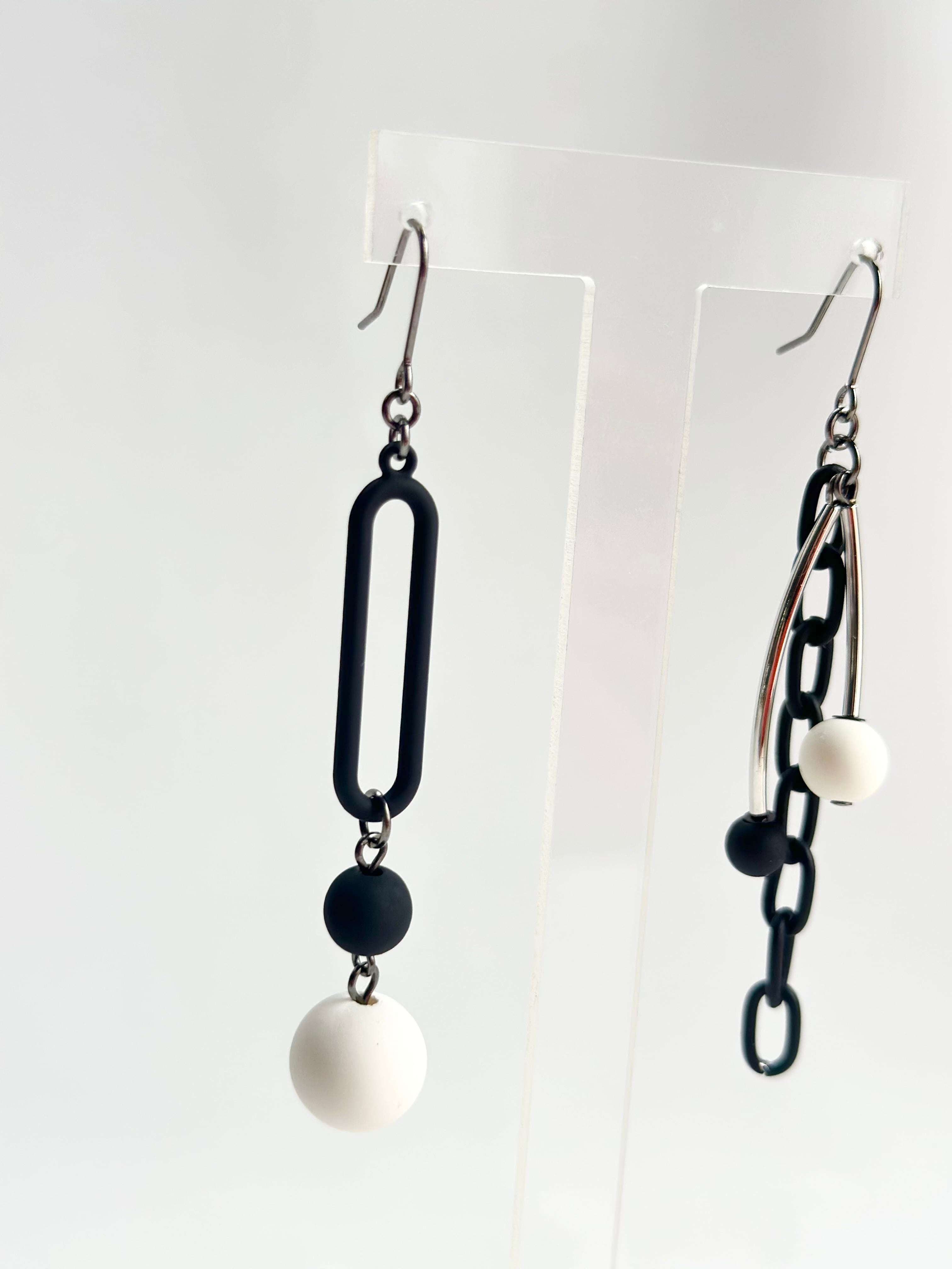 個性的ながらシンプルで、どんなスタイルにも馴染む使いやすいアシンメトリーピアス。