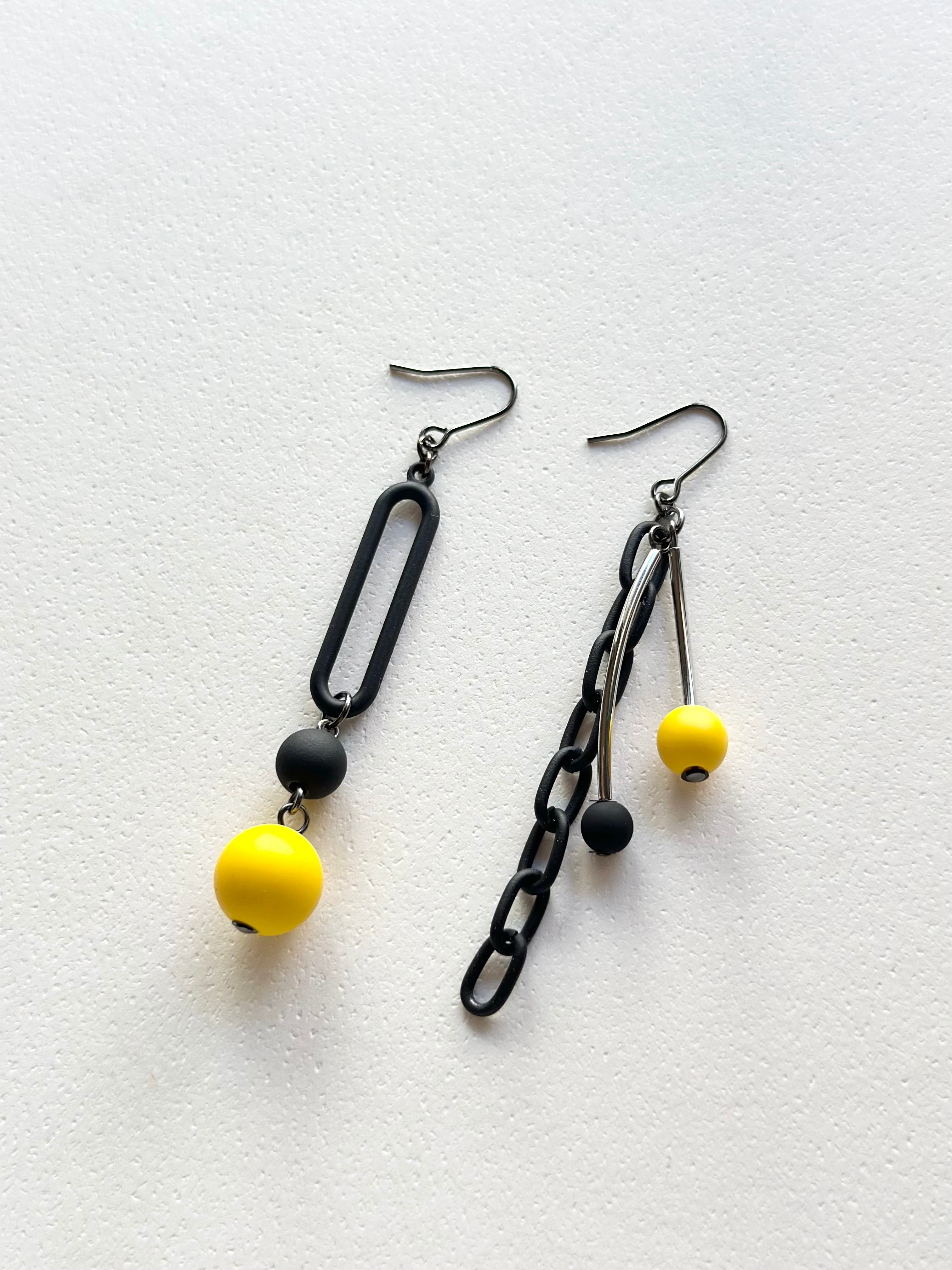個性的ながらシンプルで、どんなスタイルにも馴染む使いやすいアシンメトリーピアス。